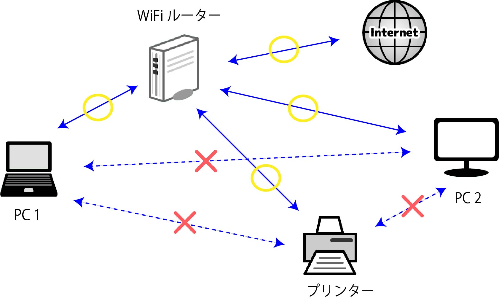 Wi-FiルーターとPC間、Wi-Fiルーターとプリンター間は接続ができますが、 PCとプリンター間で通信が遮断されます。